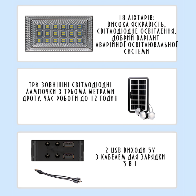 - Простота у використанні: Містить усе необхідне для швидкого встановлення й експлуатації — сонячну панель, ліхтар, три лампи та зарядний кабель;