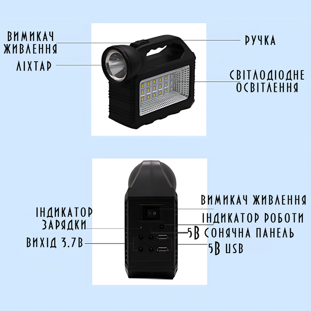 - Тип: акумуляторний ліхтар/сонячна електростанція;