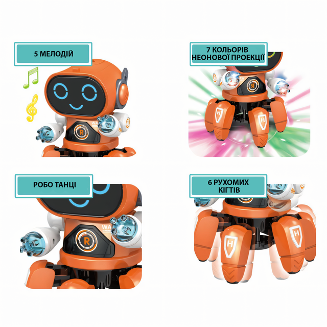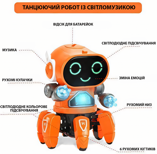 Танцюючий робот-іграшка ZR142 з музикою і світлом, електричний робот з шістьма ніжками на 3 батарейки АА