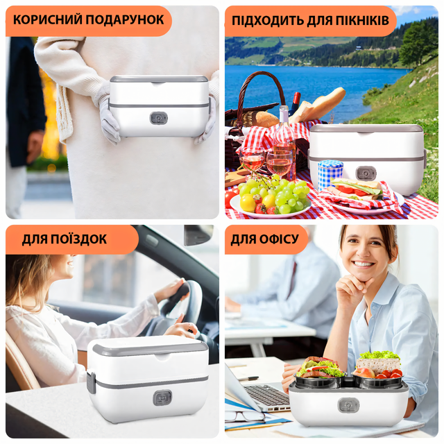 - Гарячі та смачні страви в будь-який час і в будь-якому місці: Завдяки вбудованому нагрівальному елементу ви можете насолоджуватися гарячими домашніми стравами, навіть якщо немає доступу до мікрохвильової печі;