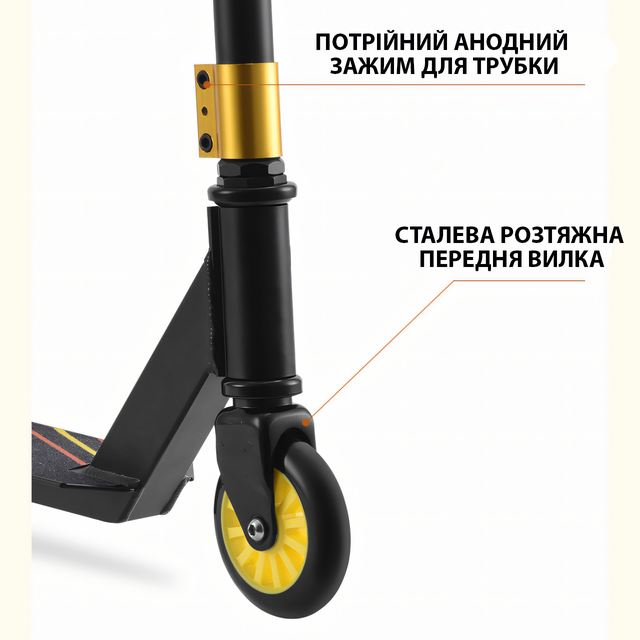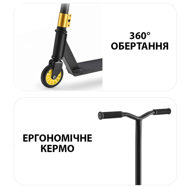 - Легка вага: Невелика вага самоката полегшує керування й виконання трюків.