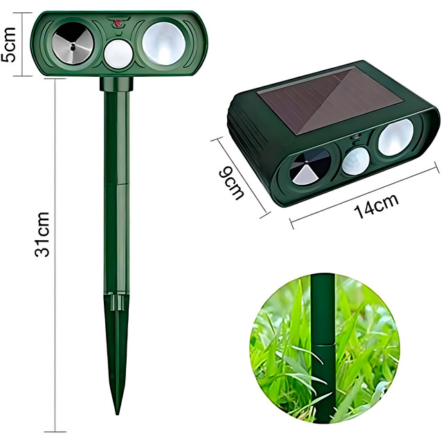- Надійність і довговічність: Виготовлений із високоякісних матеріалів, відлякувач Solar Pest Repeler ZF 858 забезпечує надійний захист вашого саду впродовж тривалого часу, з мінімальними витратами на обслуговування.