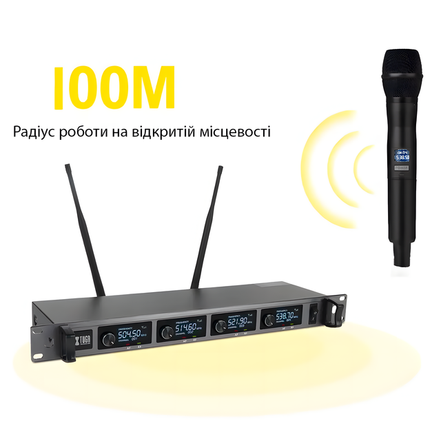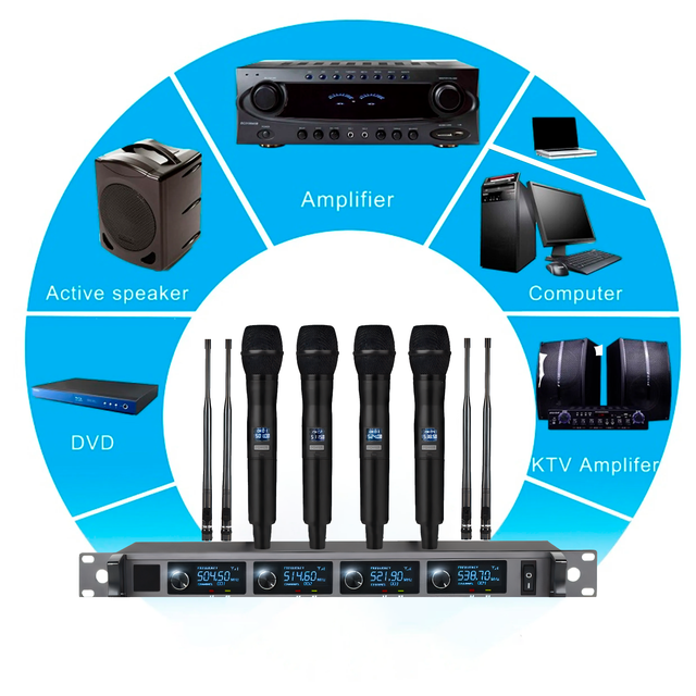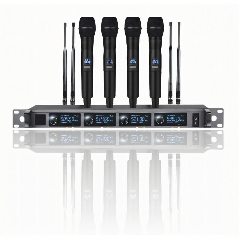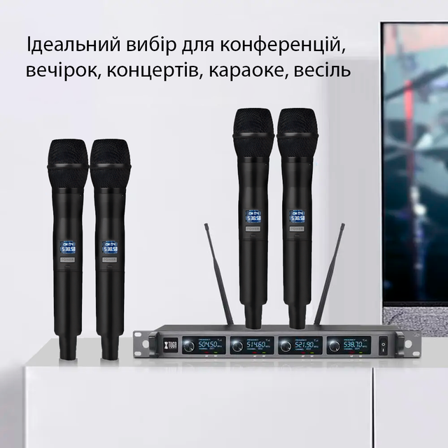- Висока якість: Бездротові мікрофони обладнані вбудованою технологією синтезу PLL для ще чіткішого сигналу. РК-екрани на мікрофонах і приймачі. 4-канальний бездротовий мікрофонний комплект має фіксовану частоту 504,5 МГц, 514,6 МГц, 521,9 МГц і 538,7 МГц, що забезпечує надстабільність сигналу та виключає небажані спотворення. Мікрофони виготовлені з металу, а не пластику;