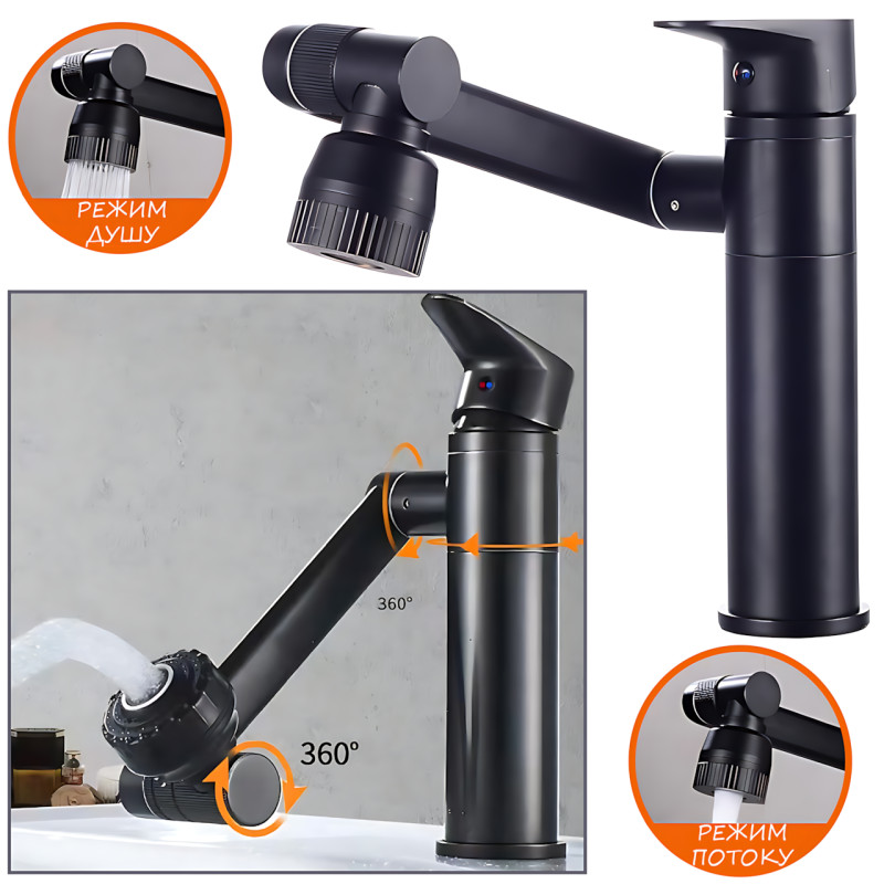 Універсальний поворотний змішувач-трансформер для ванної кімнати та кухні, обертання 360 градусів, чорний