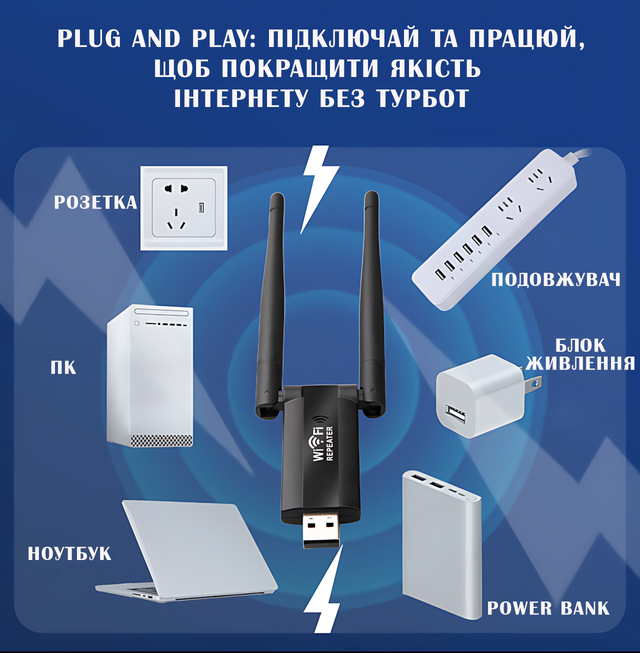 Налаштування? Простіше нікуди! Просто підключіть ретранслятор до USB-роз'єму, виконайте кілька простих кроків - і насолоджуйтеся швидким інтернетом зі швидкістю до 300 Мбіт/с. Цей крихітний гаджет здивує вас своєю потужністю і функціональністю.
