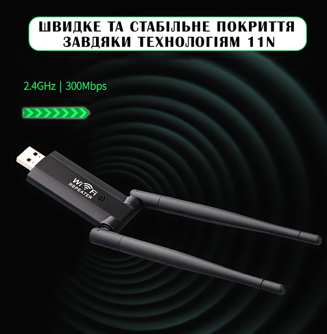 USB WiFi ретранслятор із двома антенами, швидкістю до 300 Мбіт/с, 20 м покриття
