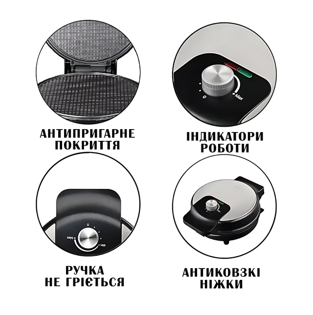 - Антипригарне покриття — забудьте про пригорілий тест і битву з лопаткою. Вафлі виходять легко, ніби самі вистрибують!