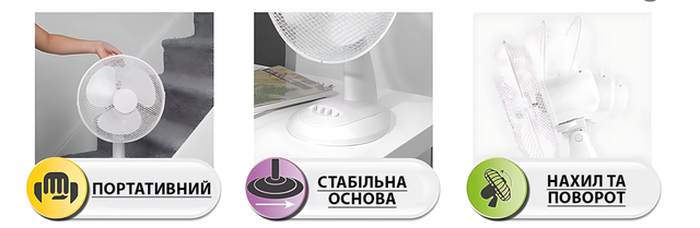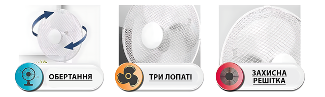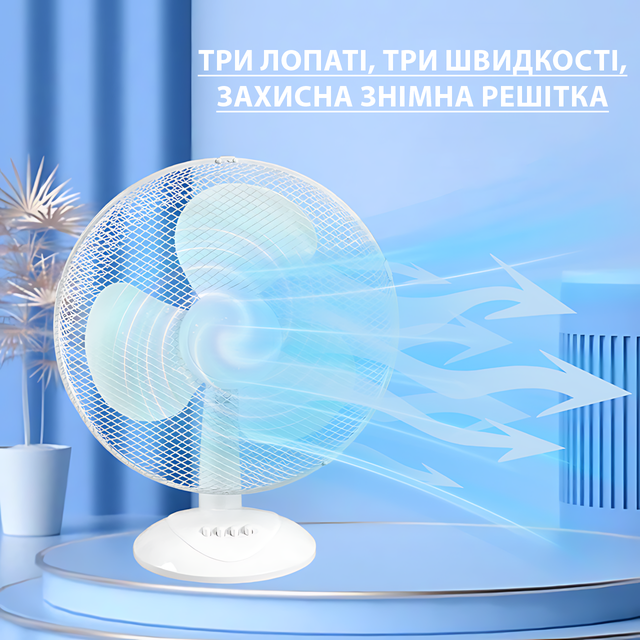 Він має три режими швидкості. Від легкого бризу до впевненого потоку. Коли на вулиці +35, а кондиціонера немає й у помині. Голова вентилятора повертається з боку в бік. Рівномірно розподіляючи повітря кімнатою. А якщо потрібно — можна нахилити вгору... або вниз. І спрямувати потік прямо на себе.