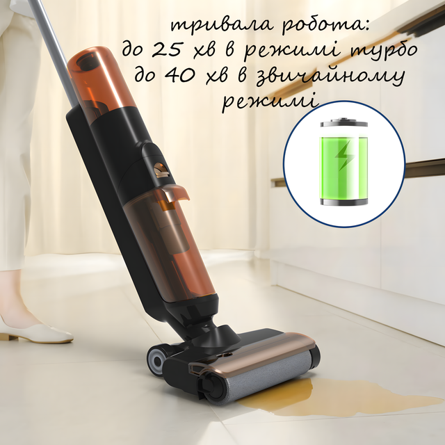 Головна перевага — свобода руху. Завдяки вбудованому акумулятору пристрій пропрацює до 25 хвилин без підзаряджання, а отже, ви зможете прибрати цілу квартиру або будинок за один прохід.