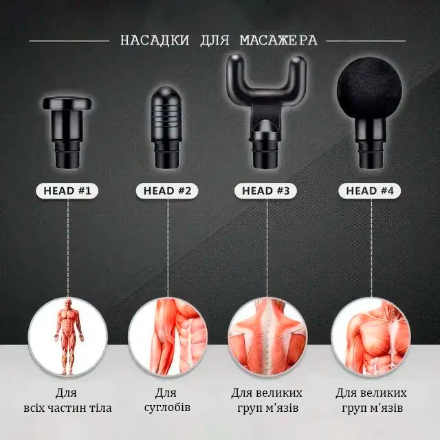 - 4 насадки впливають на певні групи м'язів ніг, сідниць, спини, грудей, зап'ястя і кісточок;