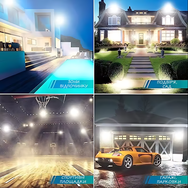 - Застосування освітлення: Для освітлення паркінгів, для освітлення вулиць, парків, для освітлення ландшафтів, для зовнішнього освітлення будівель, для РКХ, для зовнішнього освітлення фонтанів, для освітлення рекламних конструкцій;