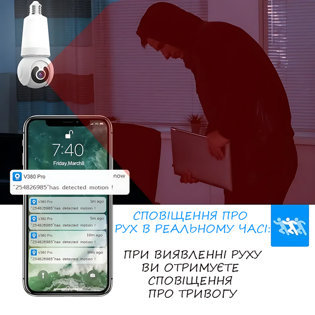 Wi-Fi камера в патрон E27, камера Panda Eyes Q26 з датчиком руху, лампою, нічним зніманням і мікрофоном