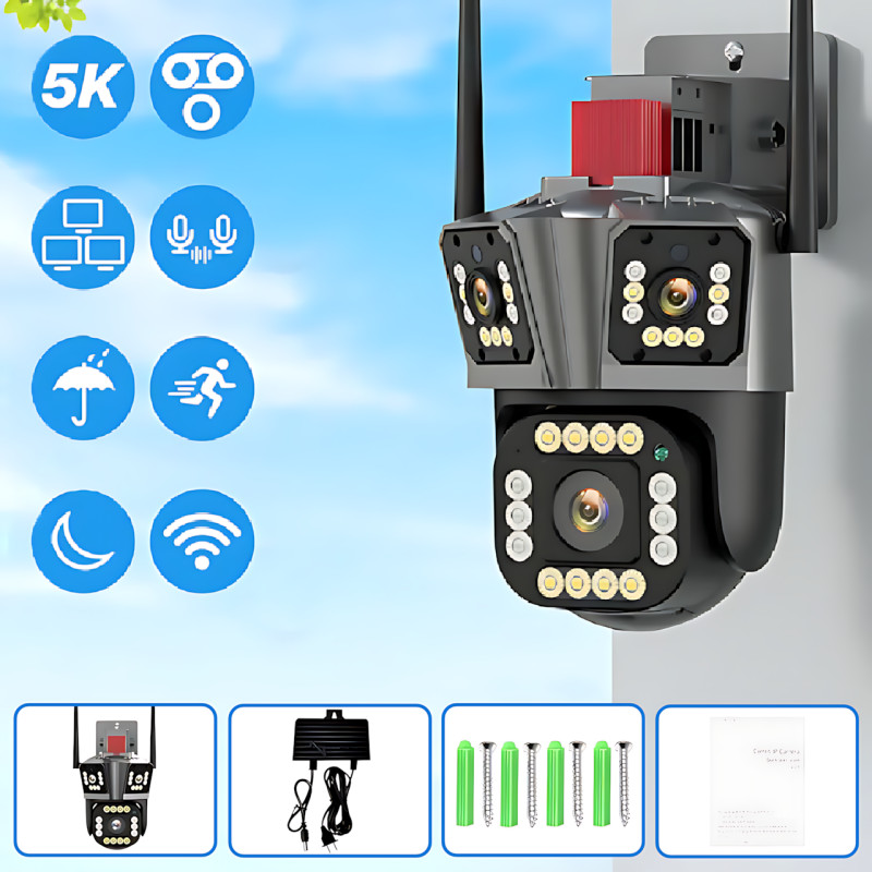 Ця відеокамера з роздільною здатністю 2K/5K розроблена для забезпечення найвищої якості зображення й багатогранного моніторингу. Вона обладнана трьома лінзами та трьома екранами, що дає змогу бачити більше деталей у будь-яку пору доби. Камера підтримує різні режими зображення й дає змогу здійснювати двосторонній зв'язок, що робить її ідеальним рішенням для охорони та спостереження.