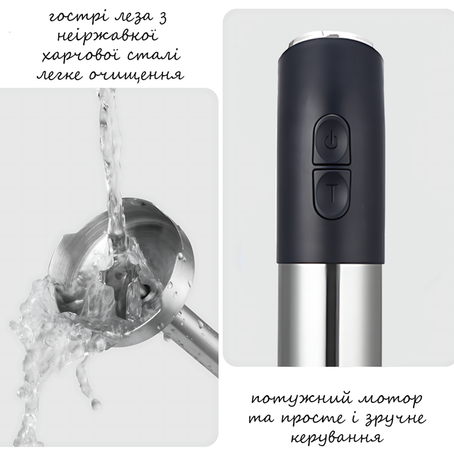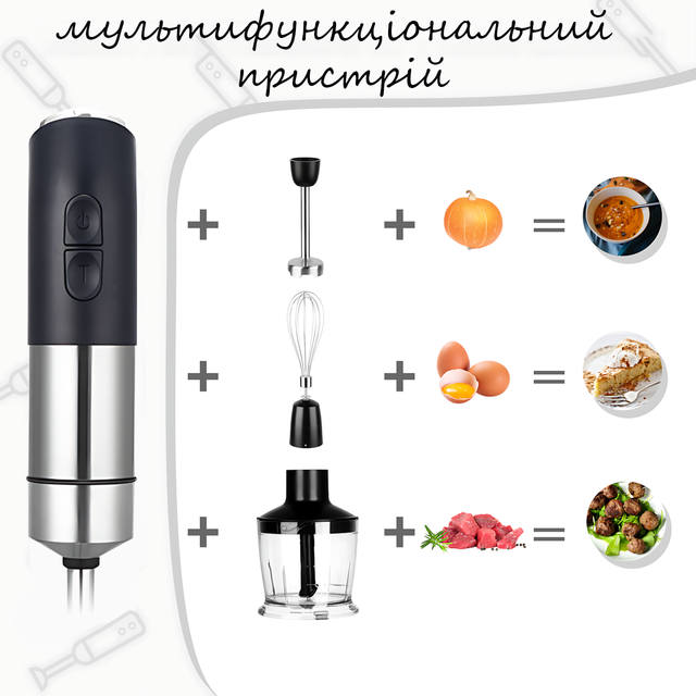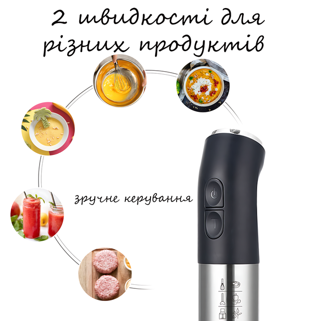 - Багатофункціональність 5 в 1: подрібнення, збивання, змішування, пюре, коктейлі.