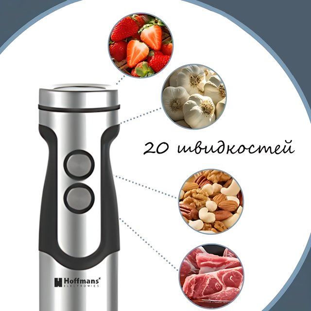 Заглибний блендер із насадками Hoffmans HM8047, 5 в 1, 1000 Вт, 20 швидкостей, мініподрібнювач, віночок, склянка