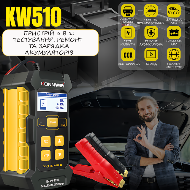 Konnwei KW510 — це інноваційний автомобільний тестер акумуляторів із функцією заряджання, який об'єднує три пристрої в одному. Підтримує роботу з гелевими, AGM, олив'яно-кислотними та мокрими акумуляторами ємністю 4-100 А·год за напруги 12 В, а струм заряду становить 5A. Особливістю пристрою є захист від замикання за неправильного під'єднання полярності. Серед інших переваг — висока якість матеріалів і збирання.