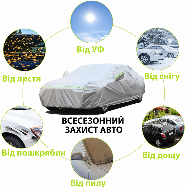 Цей всесезонний чохол забезпечує надійний захист вашого автомобіля в будь-яких погодних умовах, допомагаючи зберегти його в чудовому стані впродовж усього року.