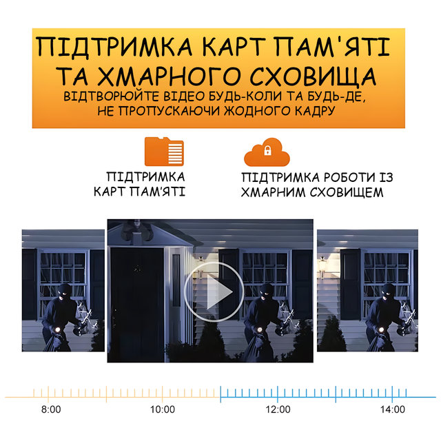 Для ночного контроля предусмотрено инфракрасное ночное видение в сочетании с белой подсветкой, что позволяет получать детализированное изображение даже в полной темноте. Камера поддерживает онлайн-просмотр, запись и воспроизведение видео через бесплатное приложение V380 Pro с русским интерфейсом.