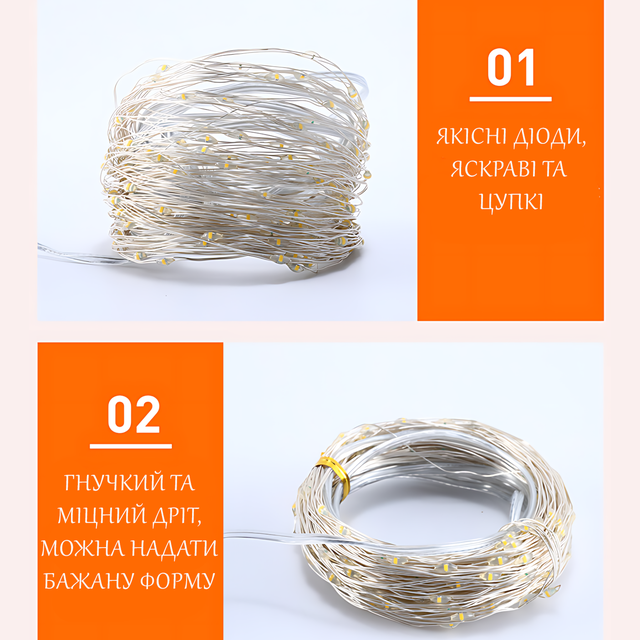 - Гибкость конструкции: Тонкий медный провод позволяет легко формировать различные световые композиции и украшать любые объекты;
