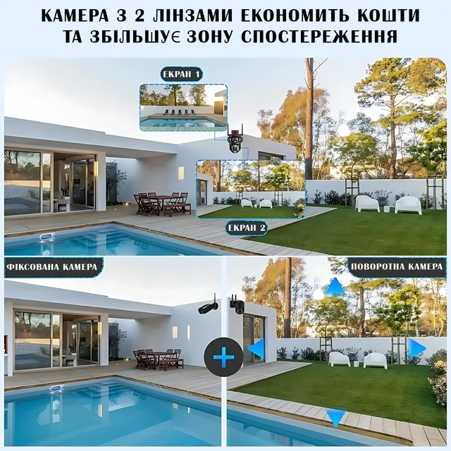 - Двойной объектив: Верхний и нижний объективы с фокусным расстоянием 3,6 мм обеспечивают чёткую картинку как на ближней, так и на дальней дистанции;