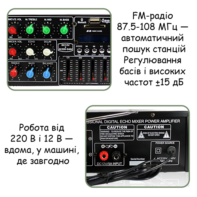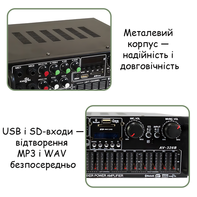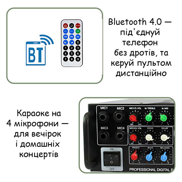 Усилитель звука AMP-326BT 300 Вт с Bluetooth, FM-радио, USB, SD, караоке, эквалайзером и пультом — мощный стерео аудиоусилитель 2×150 Вт