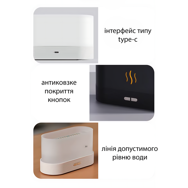 - Функции: увлажнение, ароматизация, ночник, эффект пламени;