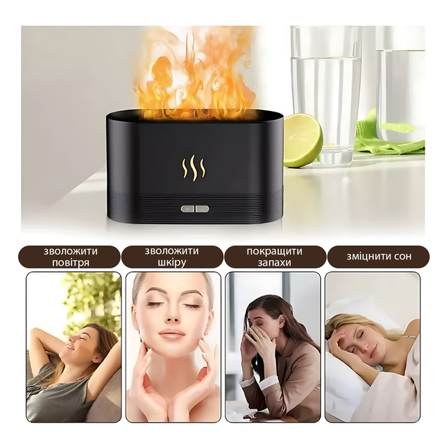 Flame Aroma Diffuser — увлажняет воздух, наполняет комнату ароматом, визуально "разжигает" маленький камин. Прямо на столе. Без дыма, без сажи-дров — зато с настроением.