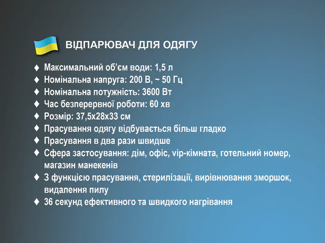 Вертикальный отпариватель для одежды идеально подходит для тех, кто ценит скорость и удобство в уходе за одеждой. С его быстрым нагревом, высокой мощностью и большим объёмом бака для воды, он станет отличным выбором для семей, занятых профессионалов и владельцев одежды из деликатных тканей. Этот отпариватель также подойдет для магазинов одежды и ателье, где необходимо поддерживать презентабельный вид товаров.