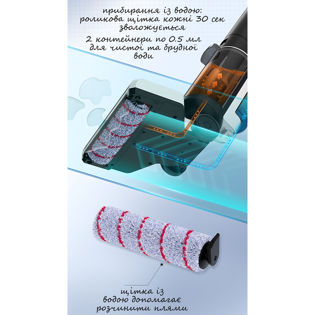 Съёмные резервуары для чистой и грязной воды по 500 л делают уборку чистой до конца — никакой возни с грязными тряпками. В комплекте есть две разные щётки: для ковров и для твёрдых полов, так что ты всегда вооружён под любую поверхность.