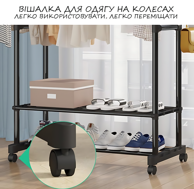 - Вешалка-стойка для одежды Double Garment Rack на колесах с регулировкой высоты;