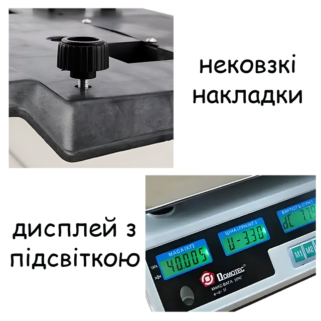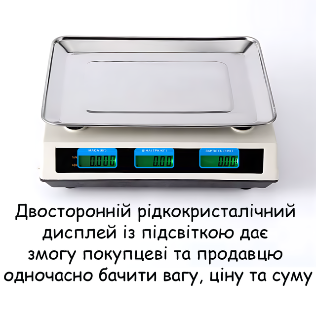 Двусторонний жидкокристаллический дисплей с подсветкой позволяет покупателю и продавцу одновременно видеть вес, цену и сумму. Подсветка регулируется, а также отображается уровень заряда аккумулятора.