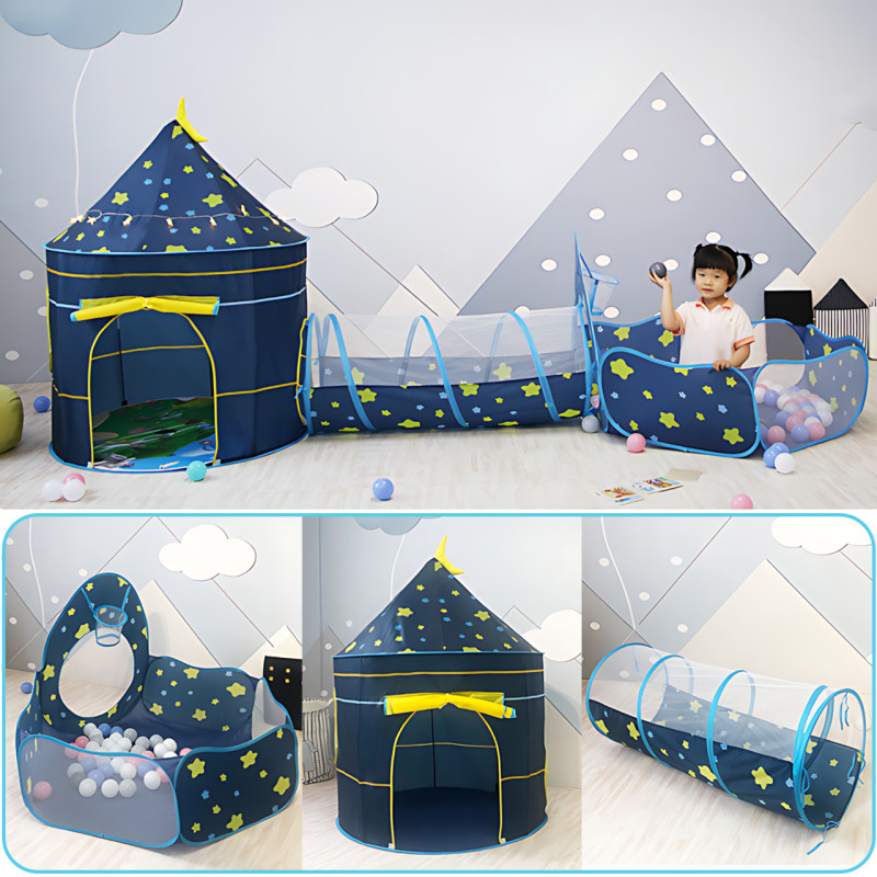 - Игровая палатка для детей 3 в 1: туннель, бассейн для шариков, замок;