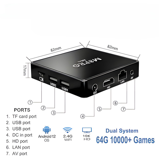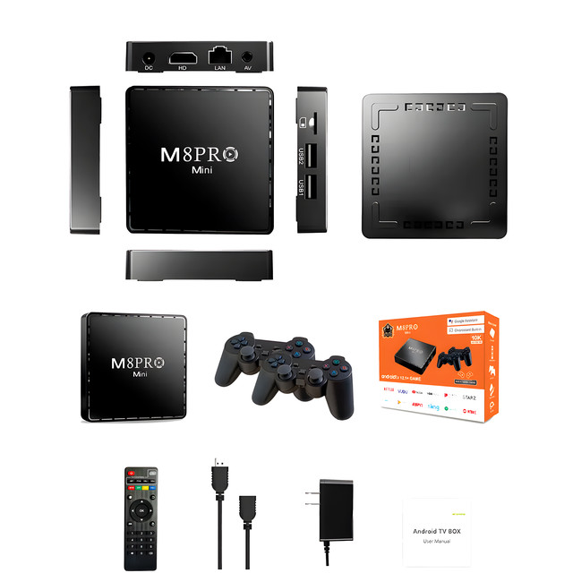 Консоль к телевизору M8PRO Mini (4k Ultra HD) с двумя беспроводными джойстиками представляет собой удобное и компактное устройство для игр, которое легко подключается к вашему телевизору через HDMI. С этой консолью вы получаете высокую производительность, удобные беспроводные джойстики, и огромный выбор игр, все в одном.