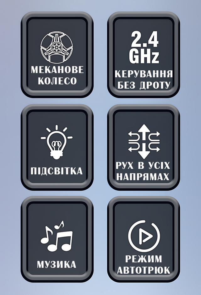 - Особенности: Дистанционное управление 2.4G, управление жестами, трансформируемый дизайн, автоматическая демонстрация, возможность езды на любой местности, звук, подсветка;