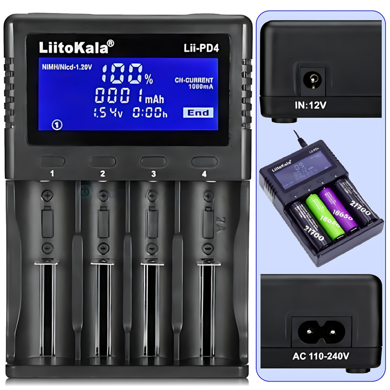 LiitoKala Lii-PD4 — это суперудобное и умное зарядное устройство, которое выручит в любой ситуации. С ним можно заряжать почти все популярные типы аккумуляторов: от стандартных AA и AAA до мощных 18650 и 21700. Устройство автоматически определяет, какой именно аккумулятор вы вставили, и подбирает для него оптимальный режим зарядки.