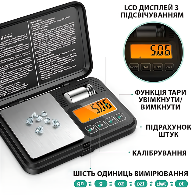Ювелирные электронные весы WB-200 200 г / 0.01 г, карманные, 6 единиц измерения, TARE, нерж.сталь, крышка, LCD