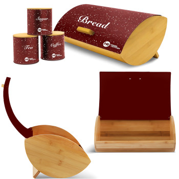 Хлебница из бамбука и металла Higher Zepline ZP-042 + 3 баночки для сыпучих продуктов, красный