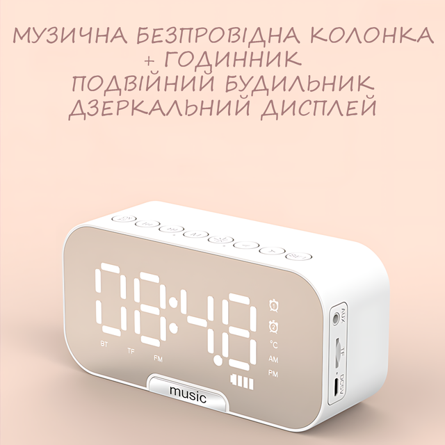 Зеркальная мобильная колонка с часами Q5 BT – это портативная акустическая система с будильником, которая сочетает в себе стильный дизайн и многофункциональность. Корпус выполнен из прочного ABS-пластика, а передняя панель обладает зеркальной поверхностью, что придает устройству современный вид. Благодаря встроенному ЖК-дисплею и двойному будильнику, колонка может служить не только для прослушивания музыки, но и в качестве часов с будильником. Она поддерживает беспроводное подключение по Bluetooth, а также имеет AUX-вход и возможность воспроизведения музыки с карты памяти.